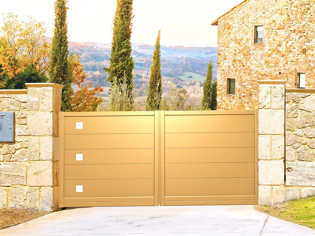 Les deux vantaux s’ouvrent vers l’intérieur ou vers l’extérieur. C’est l’ouverture la plus classique, la plus répandue, et souvent la plus élégante visuellement. Elle nécessite un espace dégagé de chaque côté pour laisser les vantaux s’ouvrir librement. Idéale pour les entrées avec une allée suffisamment large.